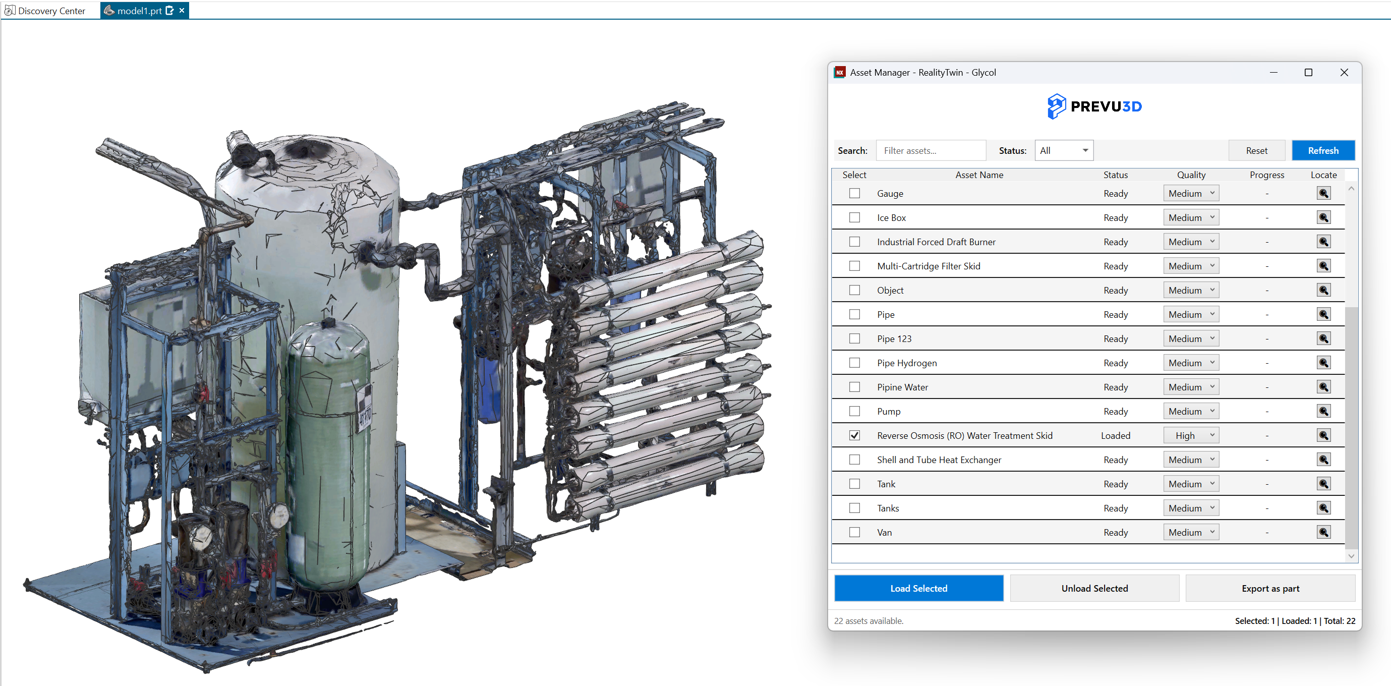 Section titled “Asset Manager”The Asset Manager allows you to browse, manage, and import assets from the selected RealityTwin into your Nx model.