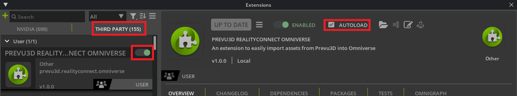 Next, go to the “Third Party” tab and enable the “Prevu3D RealityConnect Omniverse” extension using the toggle. Optionally, you can check the “Autoload” checkbox to automatically start it when USD Composer starts.