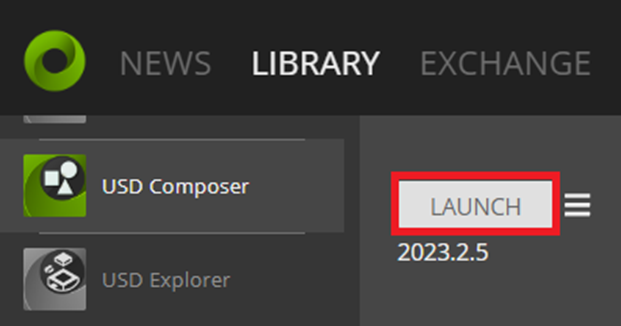 From the Omniverse Launcher, go to the Library tab and launch “USD Composer”.