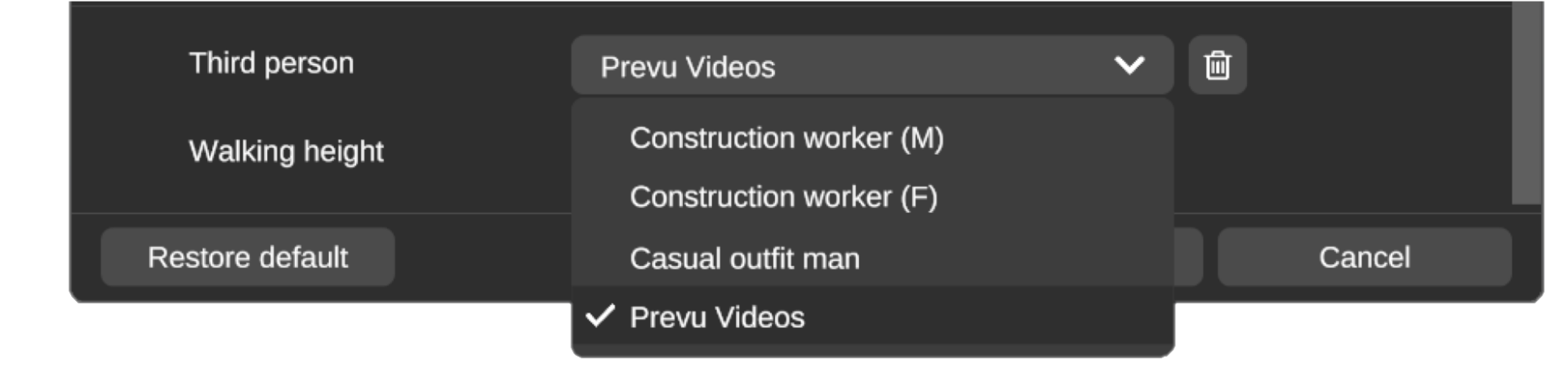 Section titled “Delete avatars”If you want to delete an avatar you can do this by accessing the settings window, changing the Third person setting to the avatar you wish to delete and pressing the trashcan icon next to it.
