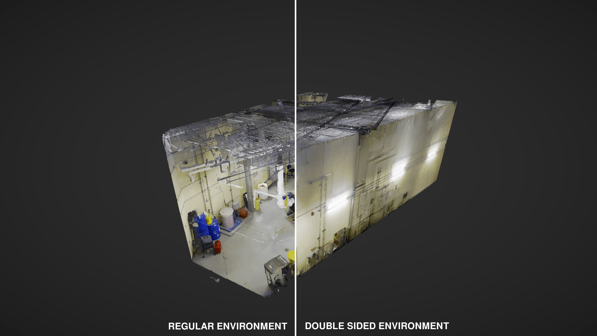 Section titled “Double Sided Environment”The double sided environment allows you to enable two sided meshes. Normally a mesh will look transparent when looking from the outside. Two sided environments apply a texture on the outside of the mesh as well.