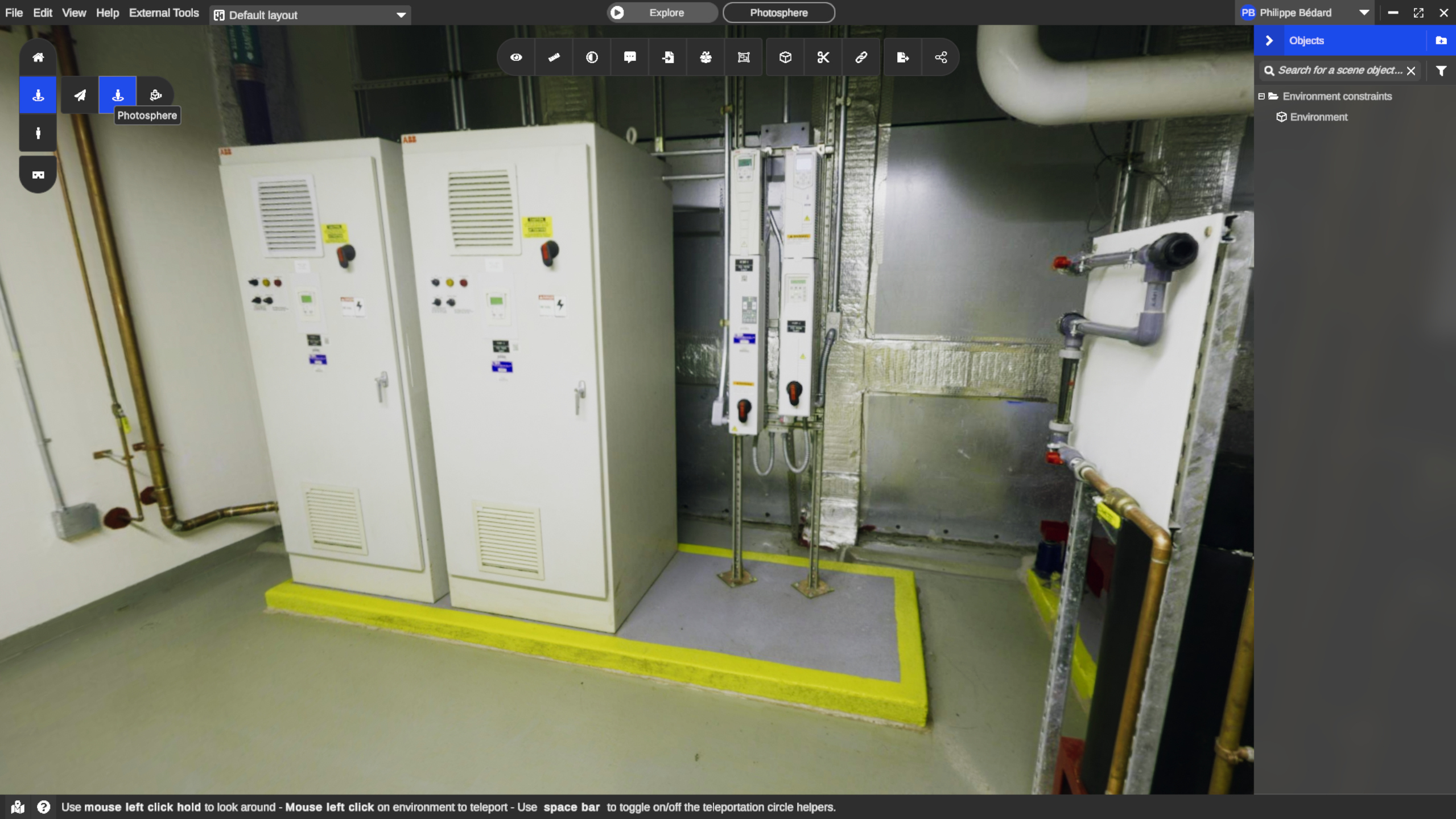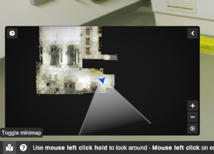 Section titled “Photospheres”The photosphere navigation mode is a good way to see the real images captured by the scanner. It also supports 3D objects, measures and annotations, blending them all into a surprisingly realistic environment. Your movements are limited to the stations position.