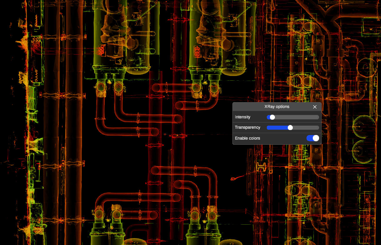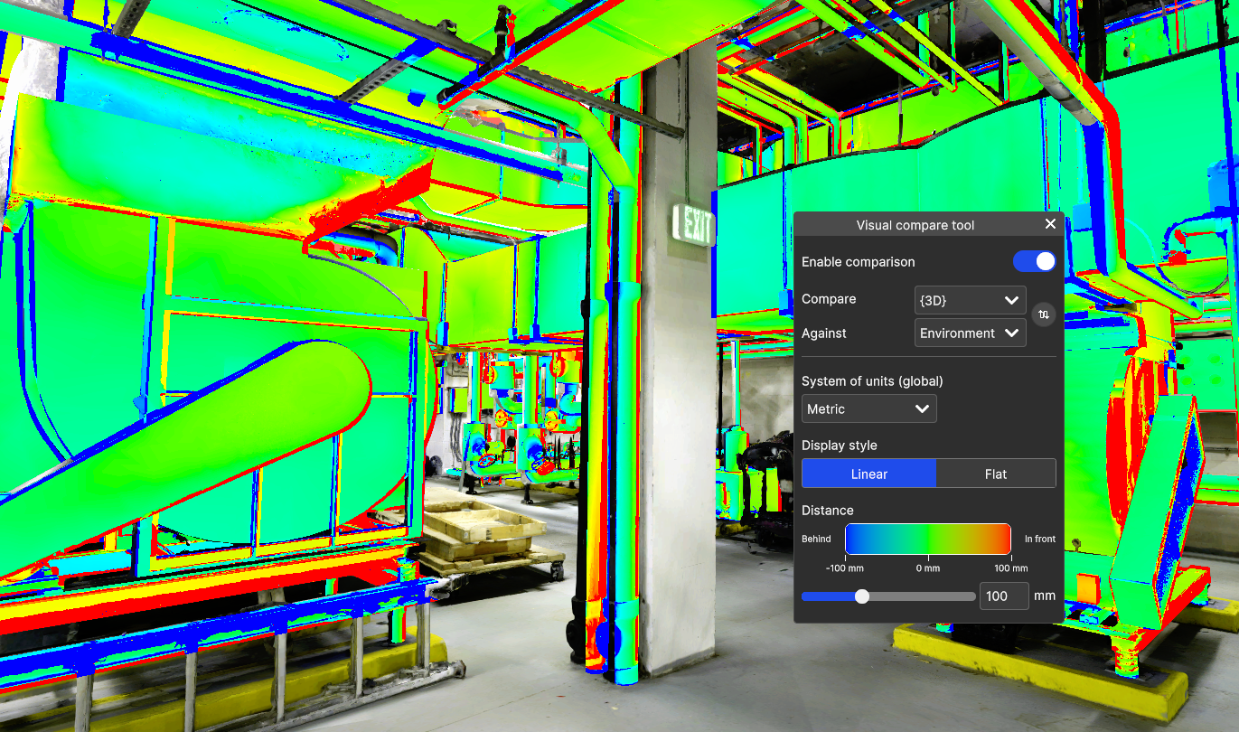Section titled “Visual Compare”The visual compare tool allow you to see the deviation between 2 selected assets. Typically you will compare the CAD asset against the scanned environment. You can find more details about the Visual Compare tool over here.