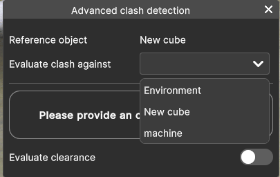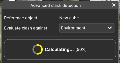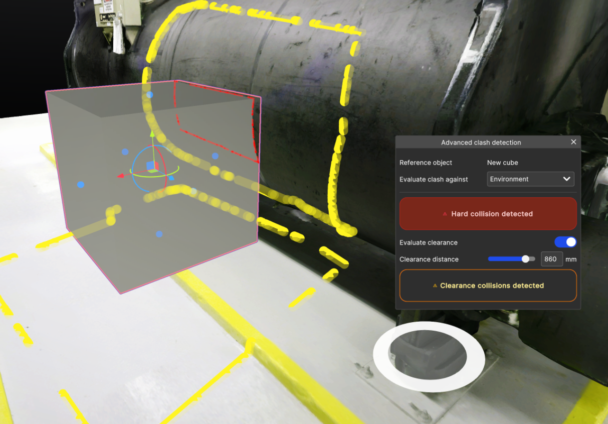 The window will indicate that there is a “Clearance collision detected”. On the asset, there will be yelow coloured dots that indicate at which points the two assets don’t respect the Clearance distance defined.