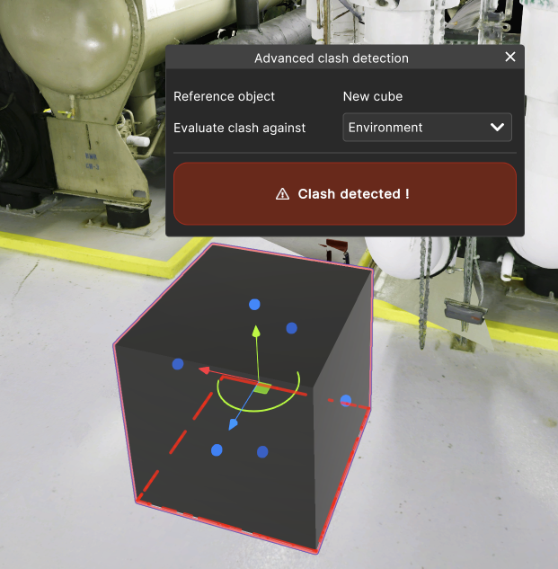 The window will indicate that there is a clash occurring. On the asset, there will be red coloured dots that indicate at which points the two assets are clashing.