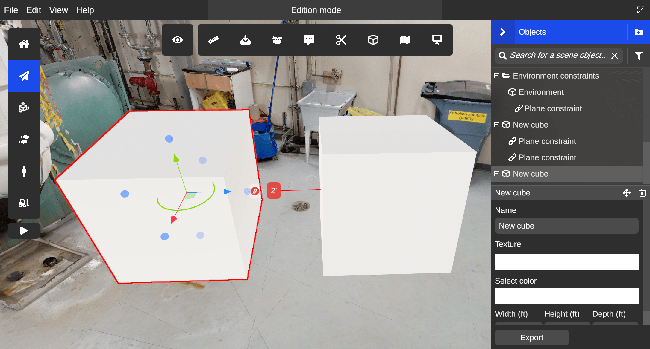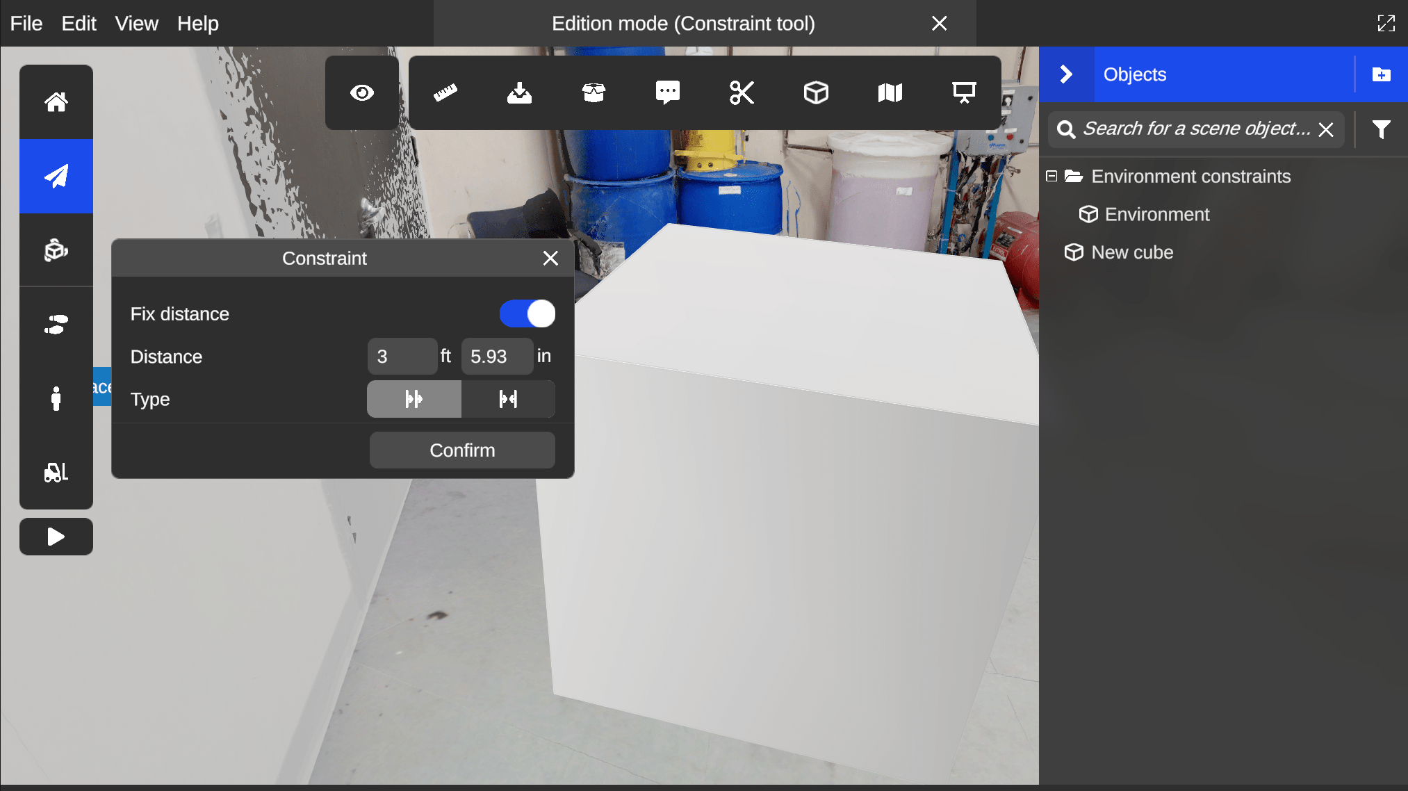Section titled “Environment”RealityPlan uses your space to create basic references for your objects. For example, you can use environment references to constrain an object at a strict distance from an existing wall.