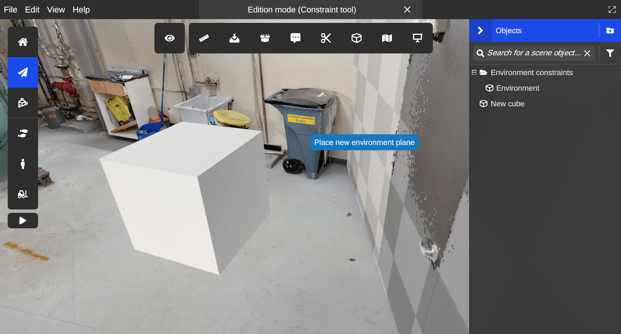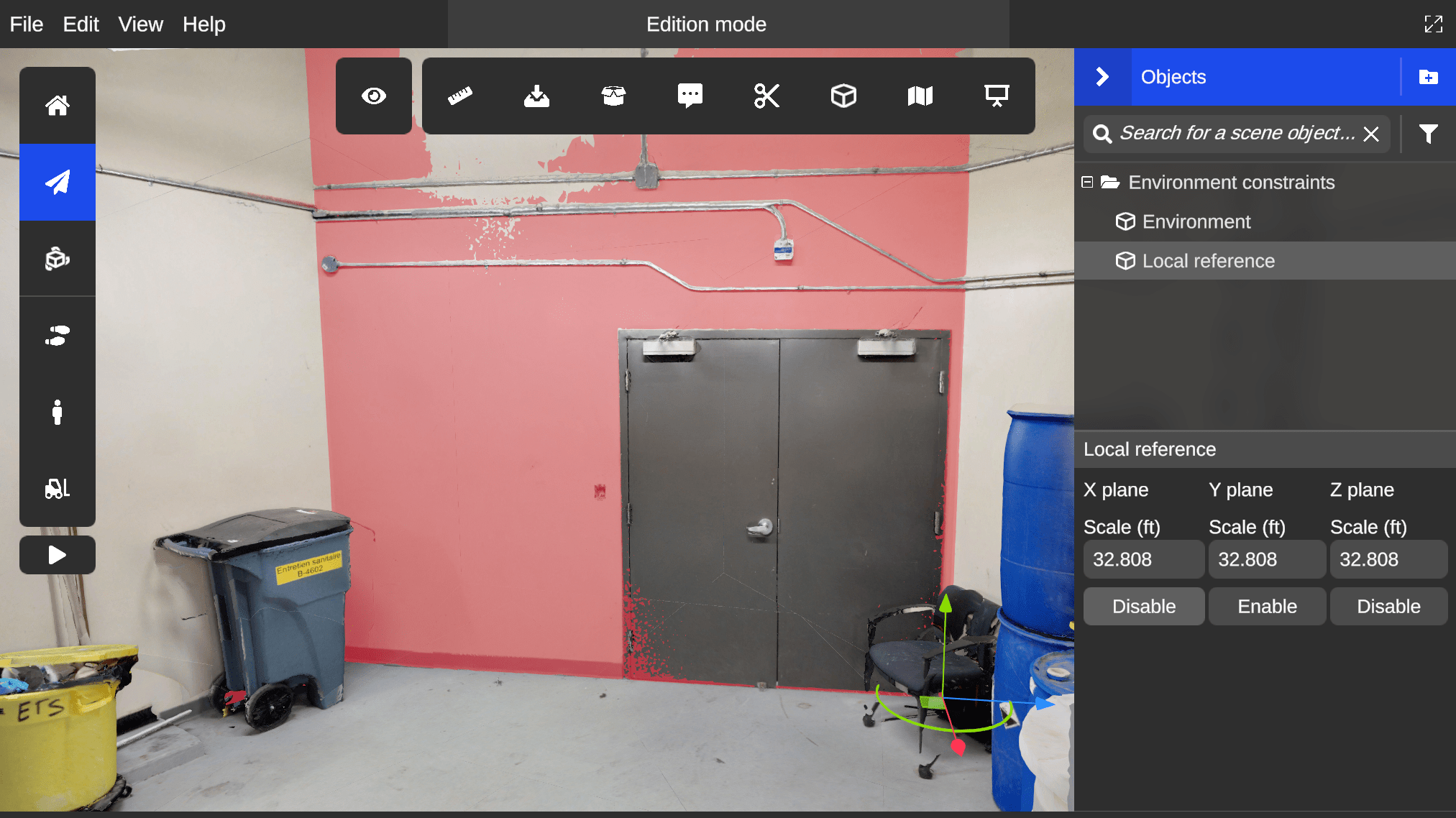 Section titled “Local references”This feature allows you to create your own references. Create a new Local Reference by selecting your environment in your Object Panel. The docked window at the bottom of the panel will display a button labelled “Create a new reference”. Position your reference point where you want in your space and adjust it to your desired orientation. Objects can now use this Local reference to restrain their movements, ensure clearances to surrounding machinery, and more.