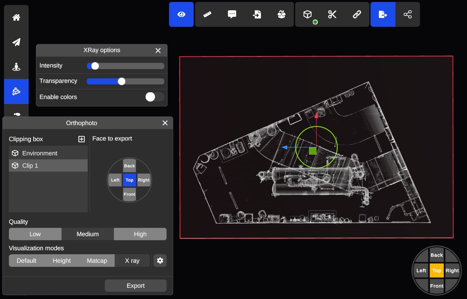 Section titled “Generate an orthophoto (orthographic image)”Using the Clipping box tool, you can generate orthophotos using various visualization modes. Using the face selector, you can easily select the face you would like to export as an orthophoto.