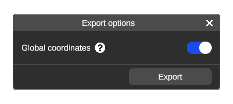 Section titled “Global coordinates (coordinate consistency)”When the Global coordinates option is enabled, the model will be exported at its position within the environment, otherwise its origin will be re-centered to the middle of the object.