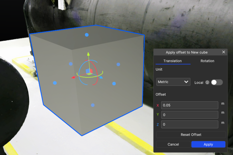 Section titled “Advanced Positioning: Apply Offset Tool”The Apply Offset Tool provides precise control over an object’s position and orientation, allowing for adjustments in translation and rotation. This tool can be accessed through the contextual menu by right-clicking the object.