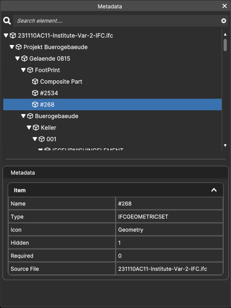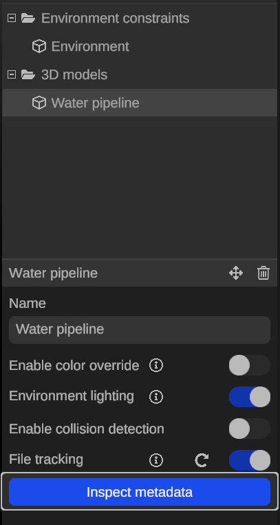 Section titled “Metadata support”When importing an asset, it may include an associated metadata file (refer to the list of file formats with the “Metadata supported”). You can visualize this metadata and the corresponding part of the model by using the metadata inspector.