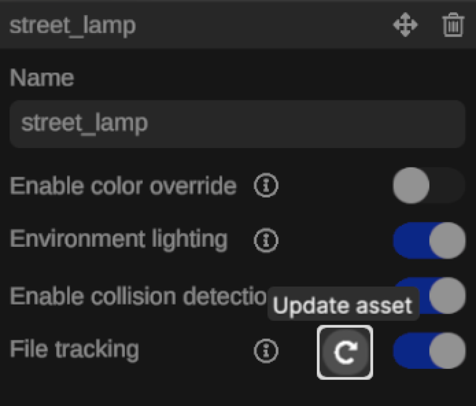 Alternatively you can update an asset in the scene individually by clicking on the update button in its side panel.