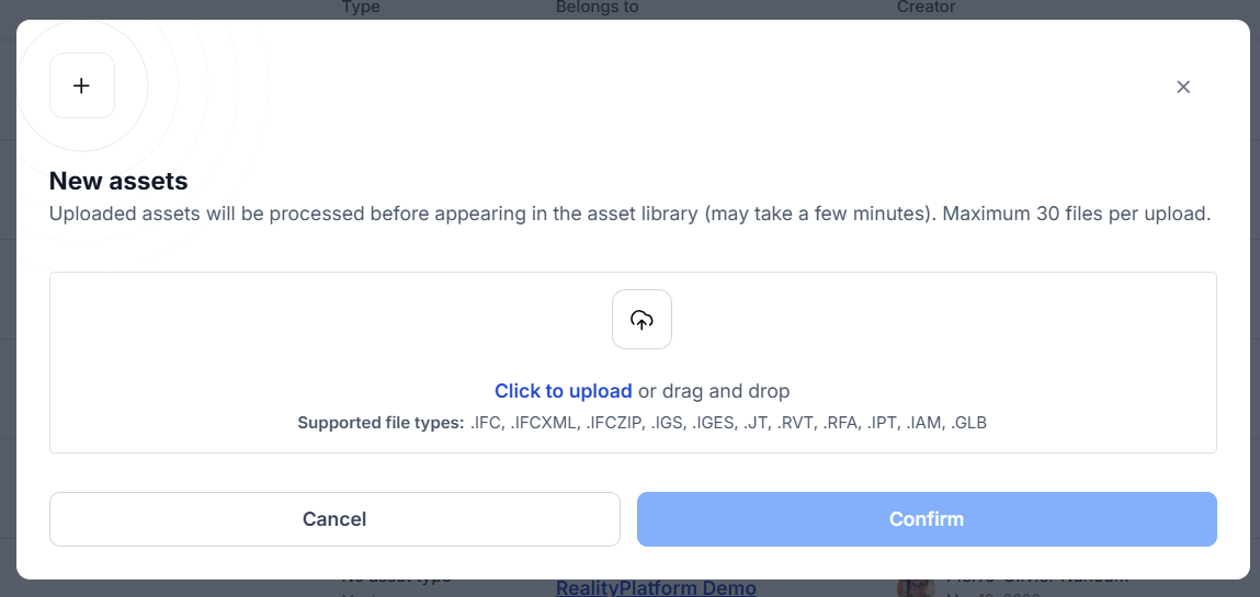 Upload new 3D models to the Asset Library and manage their status, details, and availability across your organization.