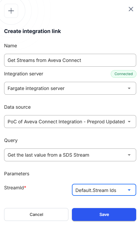 Enter a link name and select the Integration Server configured for Aveva Connect.