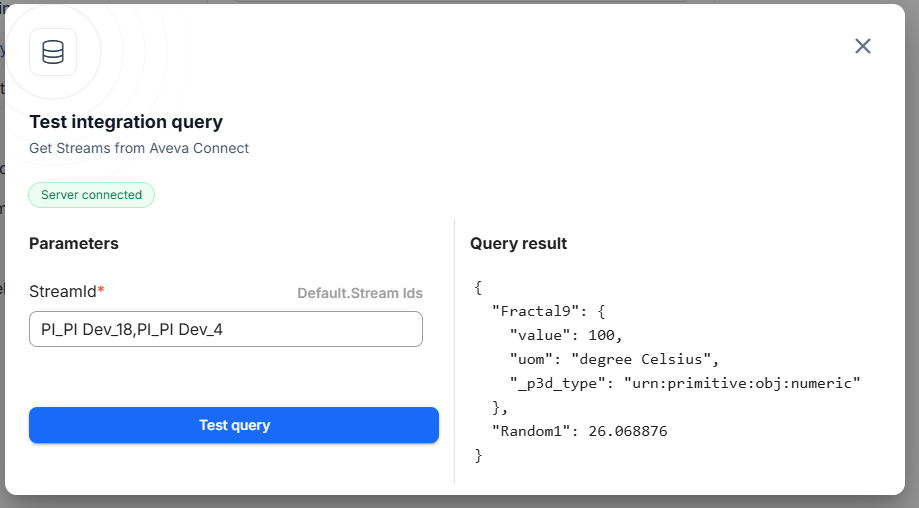 - Enter one or many stream IDs, separated by commas, under the Parameters configuration and click on Test query to see the result. The stream Ids can be obtained from Aveva Connect directly.