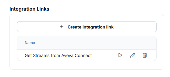 Section titled “Send a test query to validate connectivity between RealityPlatform and Aveva Connect”- On the Asset Type Settings page, click on the play button next to the integration link that is targeting the Aveva Connect data source. This will open the test query menu.