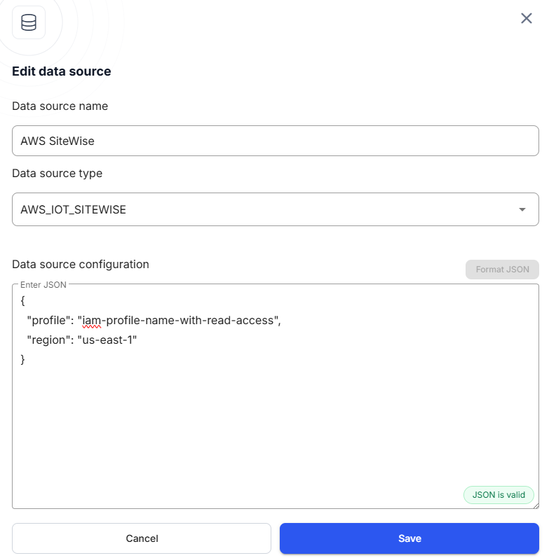 Section titled “AWS IoT SiteWise data source parameters”{ "profile": "exampleProfile", "region": "us-west-2"}profile (optional)
