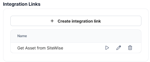 Section titled “Send a test query to validate connectivity between RealityPlatform and AWS IOT SiteWise”- On the Asset Type Settings page, click on the play button next to the integration link that is targeting the AWS IOT SiteWise data source. This will open the test query menu.