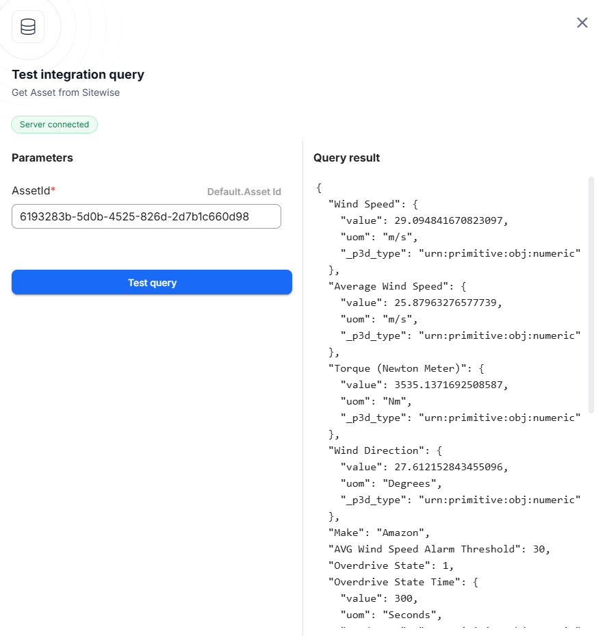 - Enter an Asset ID under the Parameters configuration and click on Test query to see the result. The asset id can be obtained from AWS SiteWise directly.