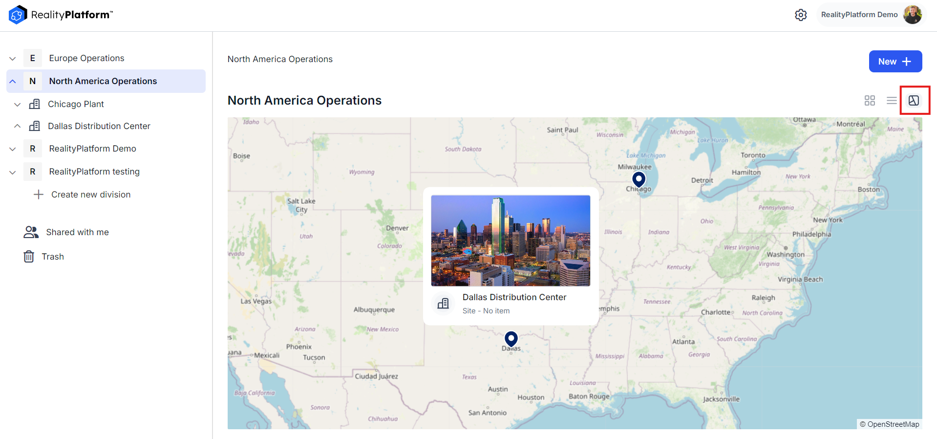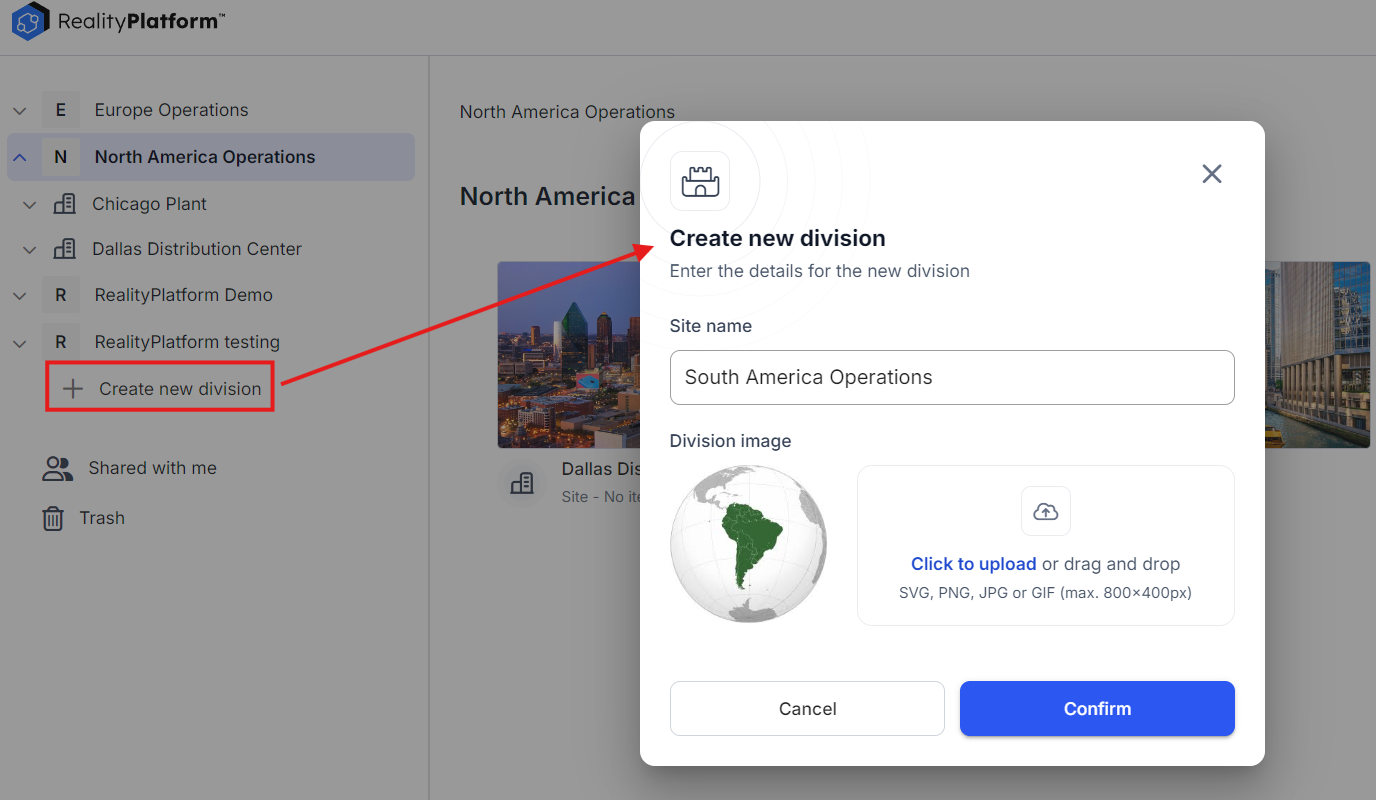 Example: A global manufacturing company may have divisions such as “North America Operations” and “European Operations,” each containing relevant sites and projects.