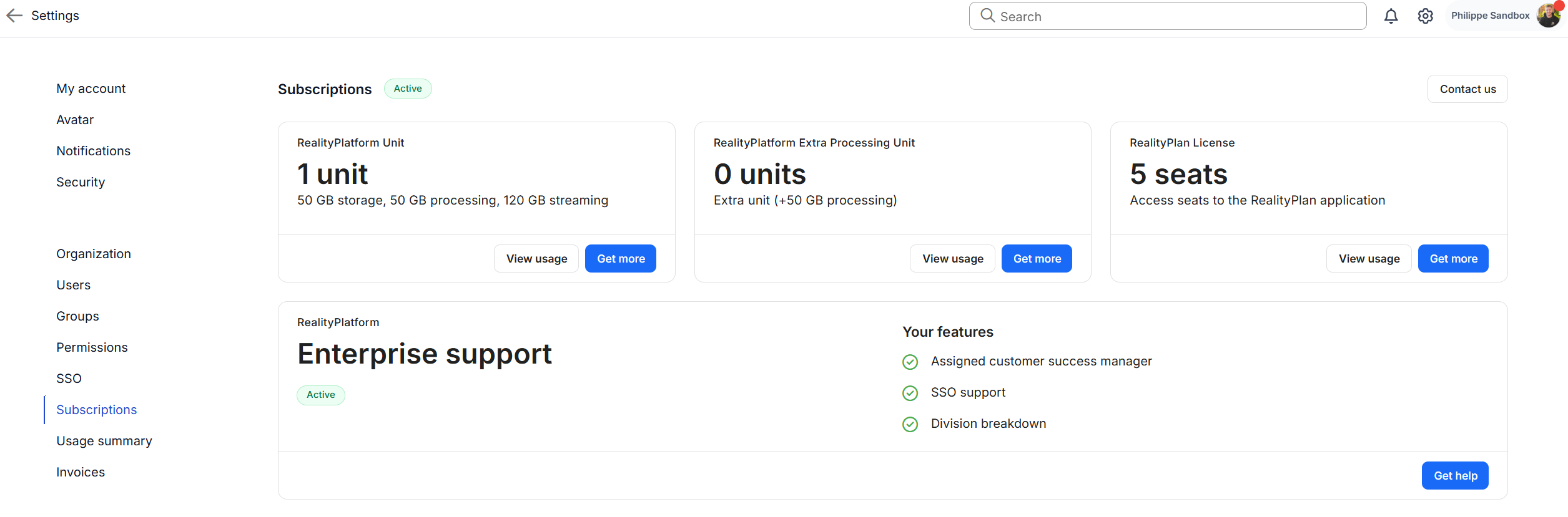 Section titled “What is the Subscriptions Page?”The Subscriptions Page provides a clear overview of your purchased items and the current status of your RealityPlatform subscription. It helps you stay informed about your plan details, track resource consumption, and manage upgrades when needed.