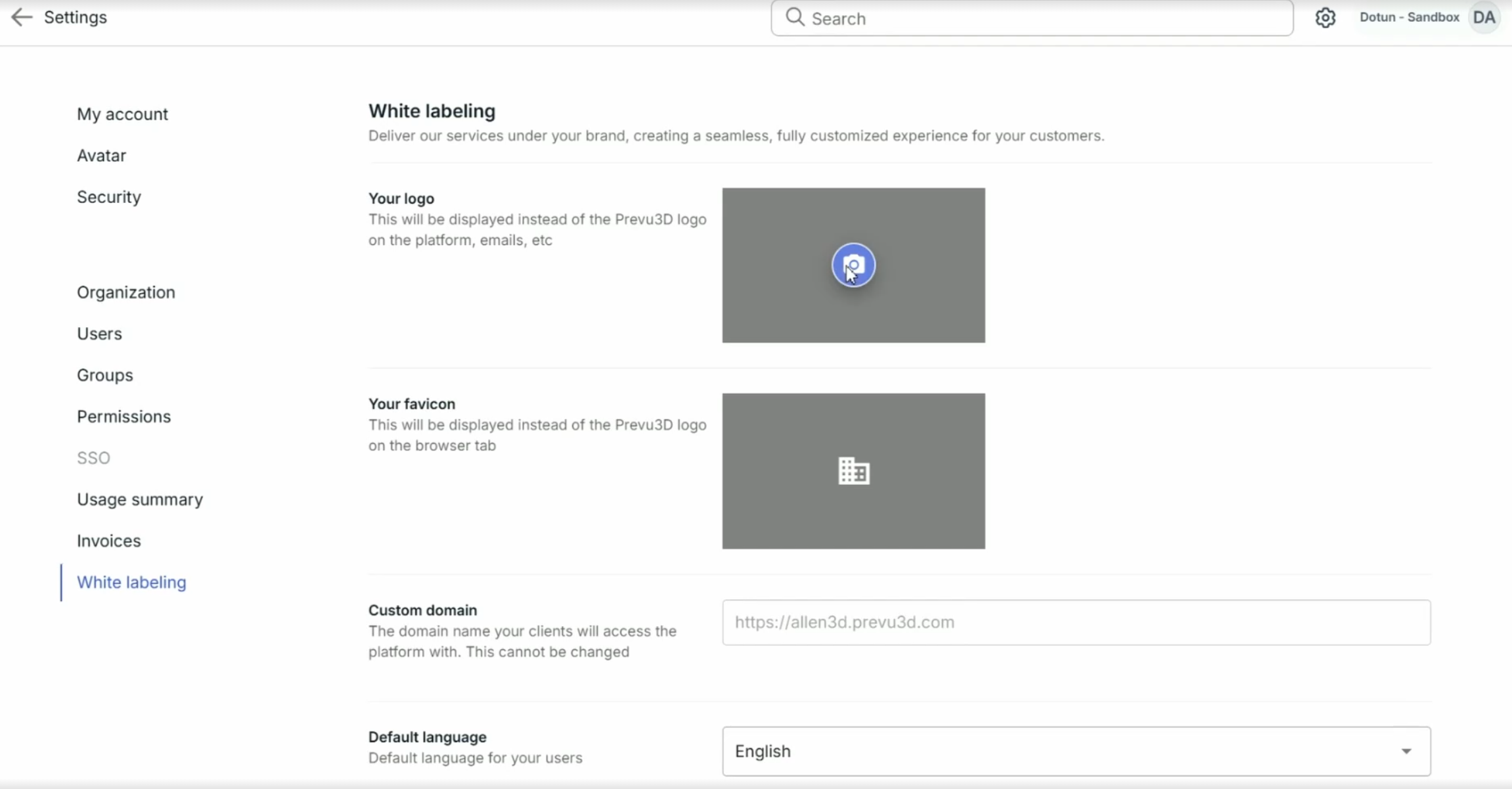 Section titled “How to Enable White Label”White Label is not enabled by default. To activate it for an account, contact your Account Manager or Customer Success Team. Once enabled, our team will configure your custom domain, replacing the standard RealityPlatform URL “cloud.prevu3d.com” with a personalized one “yourCompanyName.prevu3d.com”.