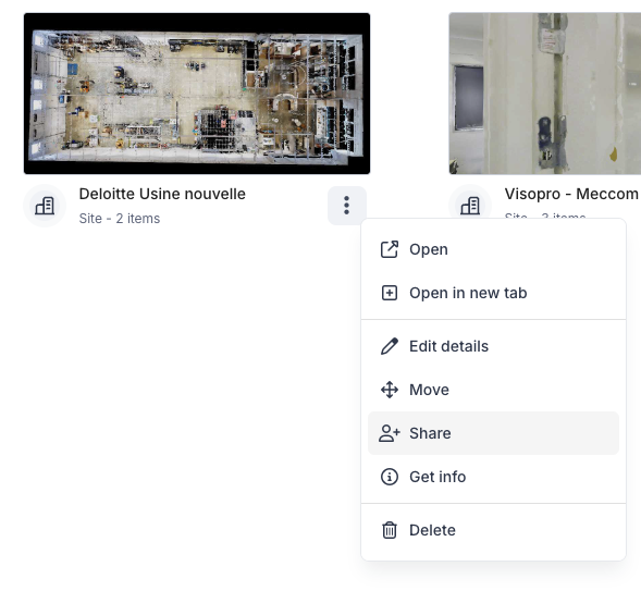 Section titled “Site Level”Sharing at the Site level provides access to all Files contained within that specific Site. If you invite someone to a Site, they will automatically have access to all the Folders, point clouds, and Design Projects within that Site. This is useful for project-specific collaboration, ensuring team members have all the necessary resources without needing to grant access to the entire Division.