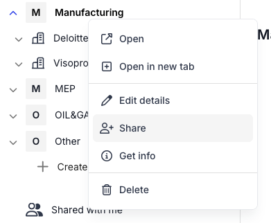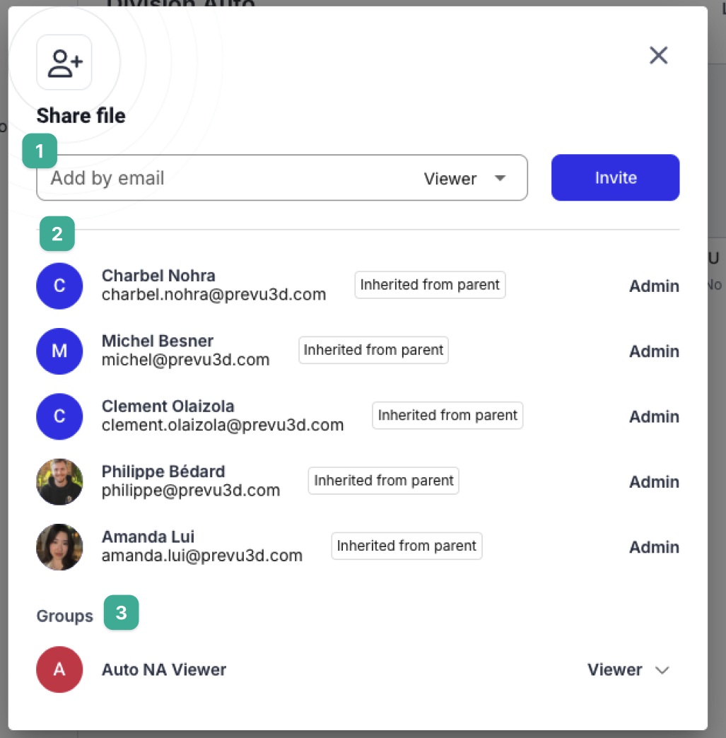 Section titled “File Level”Individual Files, such as Folders, point clouds, and Design Projects, can also be shared independently. This allows for granular access control, where specific documents or data can be shared with users without granting access to other Files within the same Site or Division.