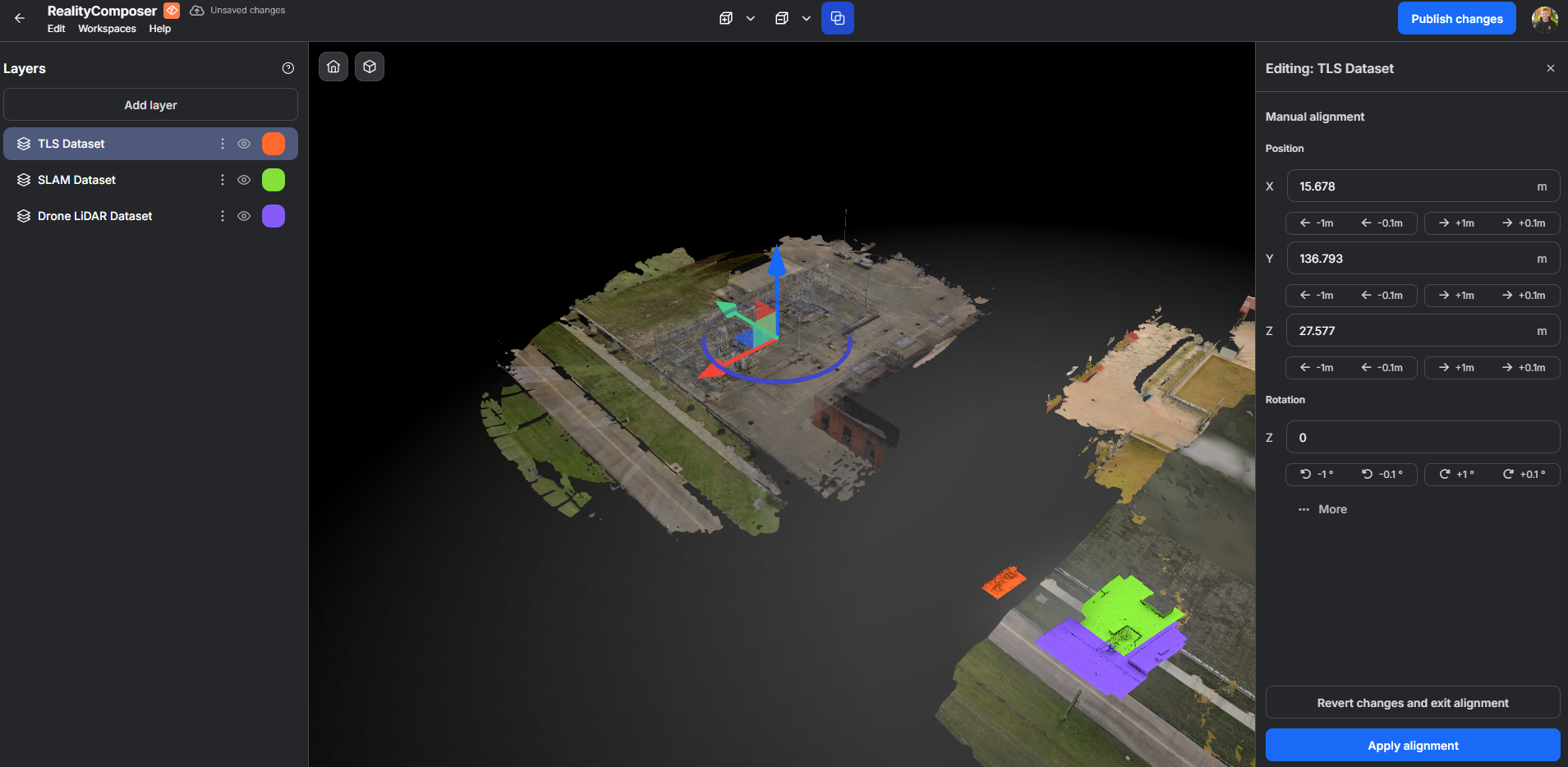 In the Composer Workspace, layer alignment helps maintain spatial consistency across scans and datasets, whether handled automatically or adjusted manually.