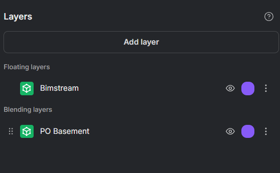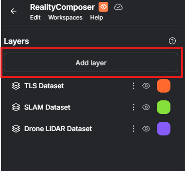 Layers in the Composer workspace allow you to build and refine your Twin by stacking multiple data bundles together, much like a volumetric Photoshop. You can add new layers, reorder them, adjust their appearance, and control their visibility while composing your space.