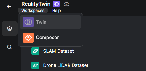 A Workspace in RealityTwin is a dedicated interface tailored to a specific aspect of the digital twin workflow. Each workspace offers a focused set of tools and capabilities designed to help users perform specialized tasks efficiently, whether they are managing assets, editing layers, or composing scenes.