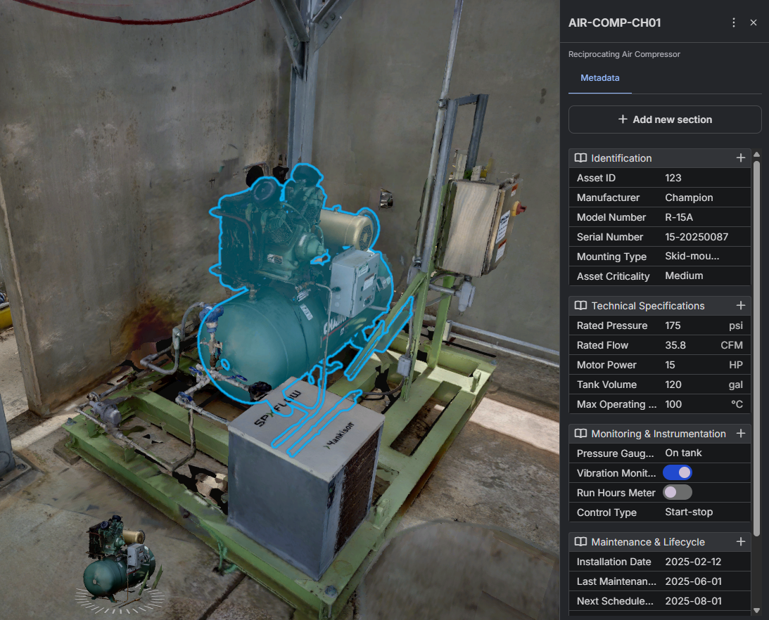 Section titled “What are RealityAssets?”RealityAssets are the building blocks within our solution that holds the intelligence between the visual layer (ie. the mesh) and the underlying parameterization of the assets. On the visual front, users can spatially define assets of various shapes and sizes within the 3d environment using our toolbox (Multi-boxes with turntable, Pipes and Magic Wand). With user-defined Asset Settings, users can add any information needed to enrich the RealityAssets - from technical specifications, inspection information, user manuals, or links to other systems.